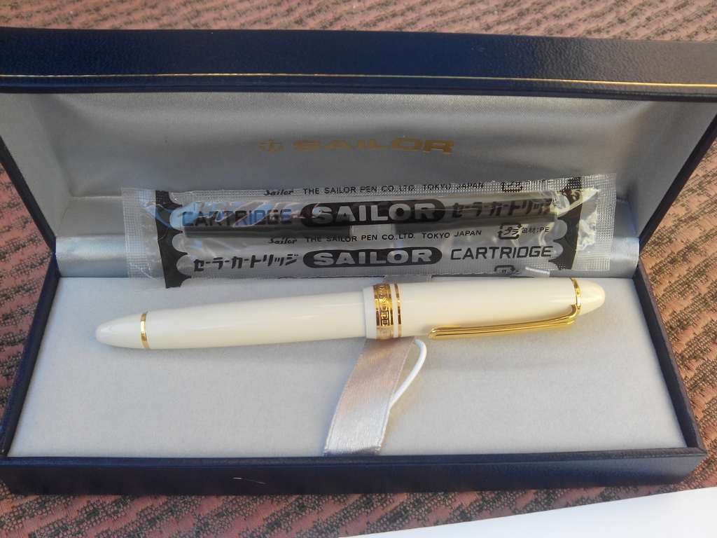 1. Солидная ручка бело-кремового цвета Sailor 1911 Standart с пером Hard-Fine из золота 585 пробы. На металлических частях отделки ручки позолота. Колпачок на резьбе. Перо довольно жесткое. Письмо очень гладкое, но со свойственной Sailor'ам обратной связью, пишет с легким шуршанием. Толщина штриха - стандартный японский Fine. Подача чернил достаточная, разрыва линии нет даже на крупных быстрых росчерках (подписях). Нажатием на ручку можно в некоторой степени варьировать толщину штриха, но не сильно - перо все-же довольно жесткое.