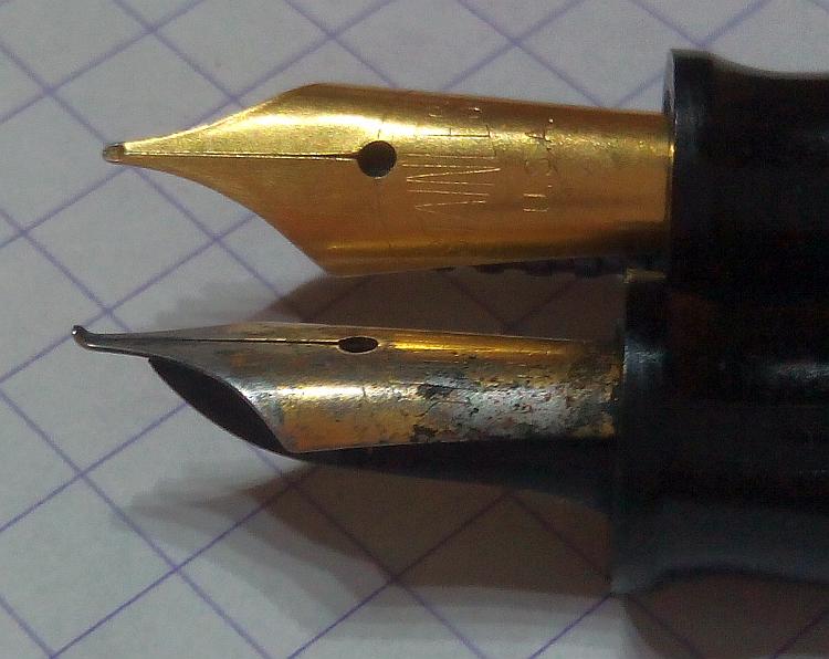 откопал у себя американскую ручку 50-х годов со стальным пером с загнутым кончиком типа fude. Это видимо кто-то специально погнул, ведь перья такого типа выпускались только в азиатских странах, верно? Для сравнения рядом почти новое перо того же производителя. Что интересно, на самом кончике сделана простая выштамповка, так что на нижней стороне пера появились небольшие выпуклости. Они не относятся к той части которая соприкасается с бумагой, видимо это оформление как-то улучшает "поток" чернил.