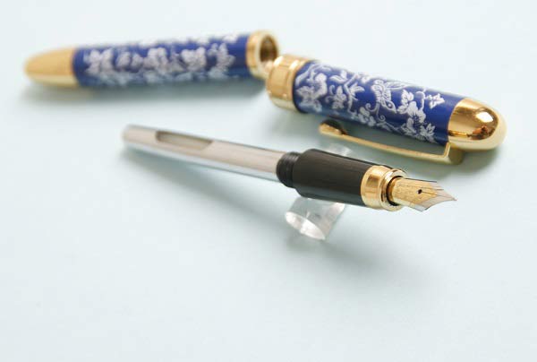 1980е годы. Открытое перо - сталь с иридиевым наконечником, заправка пипеткой. Корпус - металл покрытый керамикой с цветочным орнаментом. Длина в колпачке - 14см, без колпачка - 12,4см, толщина 1,2см, вес без колпачка - 28гр, в колпачке - 43гр.