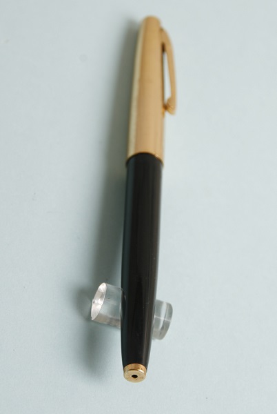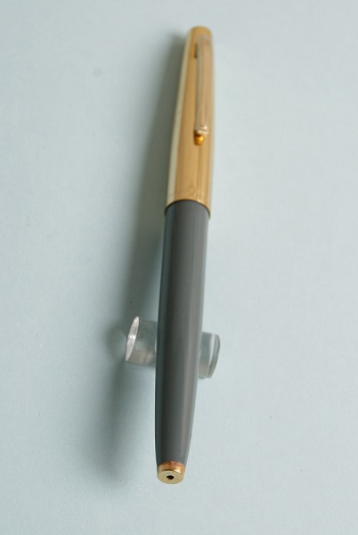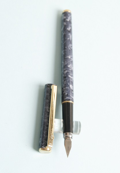 Довольно редко встречающаяся модель. Закрытое перо F, корпус пластик, колпачек - металл, заправка - пипетка. В наличии 2 цвета - морской волны и бежевый, каждого цвета - по 1 экземпляру. Длина в колпачке - 13,4см, без колпачка - 13,1, толщина - 1см. Вес в колпачке - 14гр, без колпачка - 9гр.
