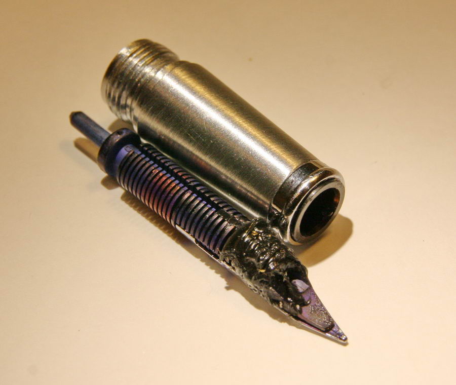 Между прочим, многие жалуются на быстрое засыхание пера. У меня было то же самое. Поможет всё тот же герметик. Нужно "промочить" им тряпичный тампон, набить в колпачок, провернуть, и достать через несколько дней. Система выравнивания давления в колпачке перестанет работать, конечно, но зато высыхать не будет. Впрочем, всё на Ваш страх и риск