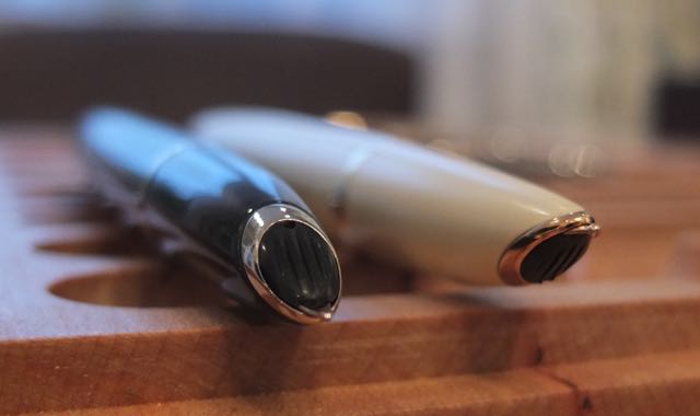 Колпачок тяжелый, выполнен из металла. Качество финишной обработки очень высокое. Покрытие матовое, ощущается как шелк на пальцах. Клип жесткий, украшен вставкой из белого полированного металла.