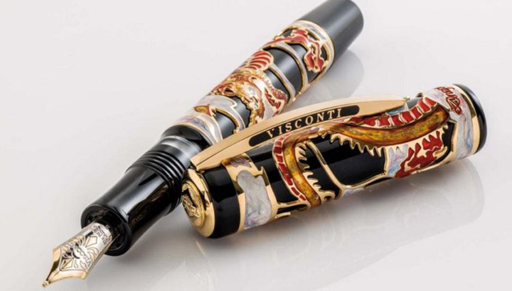 Коллекция ручек Visconti Dragon 2012 Новая ограниченная серия ручек Visconti посвящена году дракона. Черный корпус и колпачок ручки Visconti Dragon 2012 украшает накладная рубашка из позолоченного серебра с многоцветным лаковым покрытием в форме дракона – символа 2012 года. Перьевые ручки снабжены запатентованной Visconti поршневой системой заправки с двумя резервуарами и палладиевым 23К пером, доступным в шести размерах. Коллекция выпущена ограниченным тиражом – 888 ручек из позолоченного серебра и 38 экземпляров из 18К золота. Ориентировочная стоимость перьевой ручки Visconti Dragon 2012 – 3750 долларов. ![]() |